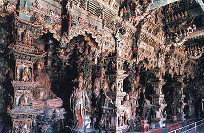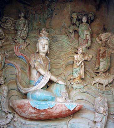 中国雕塑往往有背景的描绘,独立的圆雕毕竟在表现空间体量方面有着一定的局限,背景中图像的雕绘可以起到意蕴方面的补充。中国特有的塑绘结合的艺术,寓装饰性于空间感中,那山水画一般的空灵意境之表现,使得有限的空间深远化、无限化了。