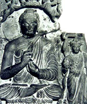 犍陀罗国创始者,原为公元1世纪入主其地的大月氏人(在敦煌附近),后疆域扩大,建都今巴基斯坦的白沙瓦城。这里曾为希腊人长期占领,留下希腊风格的雕塑艺术。犍陀罗人汲取古埃及、希腊、罗马、波斯的雕刻手法,并加以发展,形成表现美的比例、和谐的几何形体和真实、焕发生命力的人体雕塑艺术。佛像顶上的肉髻,被希腊雕刻常见的优美自然的波浪式卷发所覆盖,佛像通肩式袈裟,类似希腊罗马雕刻的长袍,襞褶厚重。面部表情平淡、高贵、冷静,半闭的眼睛流露出沉思内省的神态。