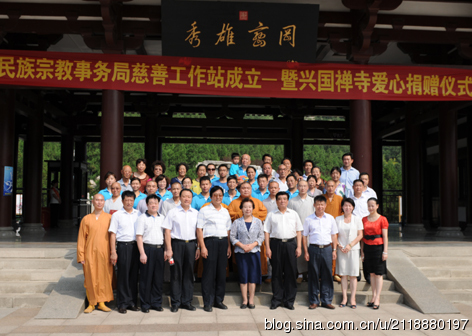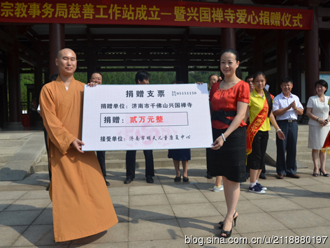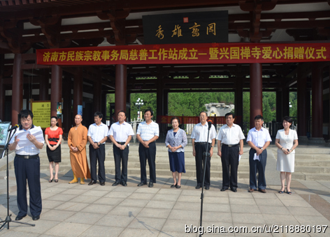 2013年8月16日,济南市民族宗教事务局慈善工作站成立-暨兴国禅寺爱心捐赠仪式在千佛山南门广场举行。出席活动的领导同志有:济南市慈善总会会长张泽,济南市残联副理事长刘曰泉,济南市民族宗教局局长米俊伟、副局长任立新,省佛教协会副会长、济南市佛教协会会长陶书童,省佛教协会副会长、济南市佛教协会副会长兼秘书长释弘庵,济南市残联康复处处长张秀芹,济南市残疾人康复中心主任俞艳等。