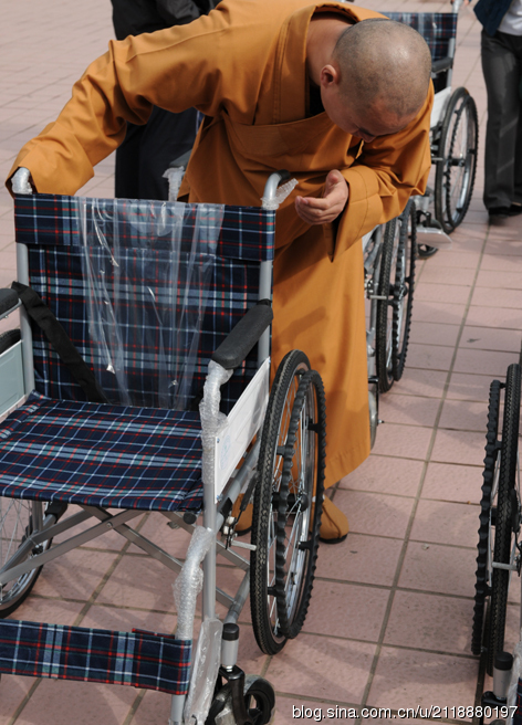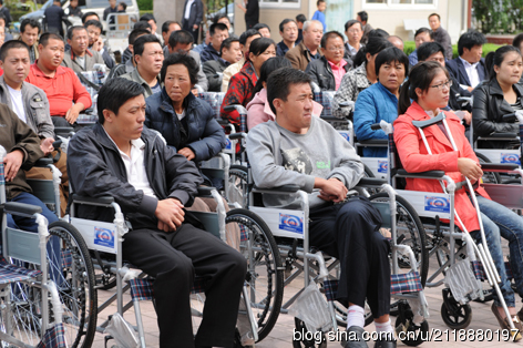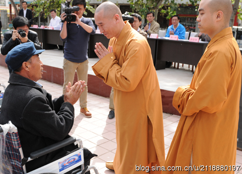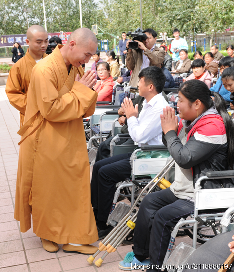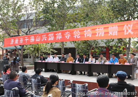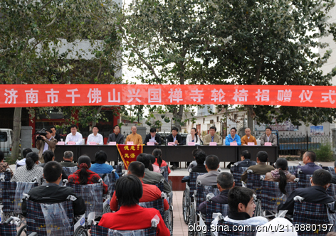 为了帮助更多贫困肢体残疾人融入社会,共享物质文化,倡导“平等、参与、共享”的现代文明残疾人观,形成“理解、尊重、关心、帮助”残疾人的良好社会风尚。济南市佛教协会、千佛山兴国禅寺与济南电视台志愿者站联合举办向商河县贫困肢体残疾人捐助轮椅100辆的活动。