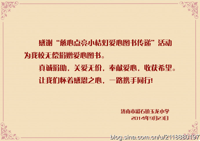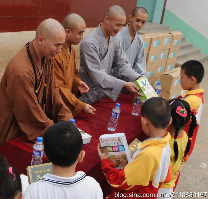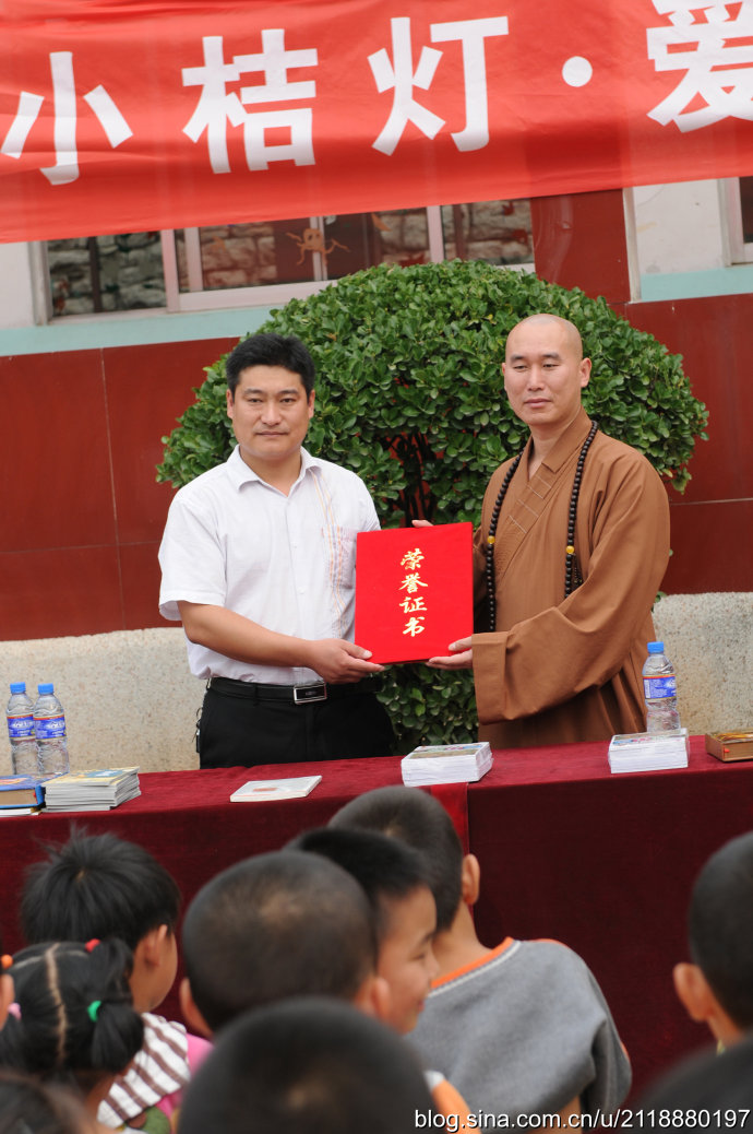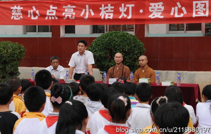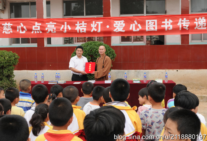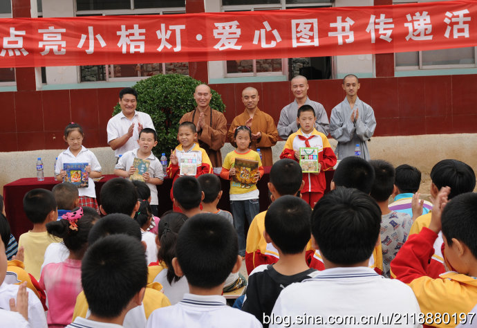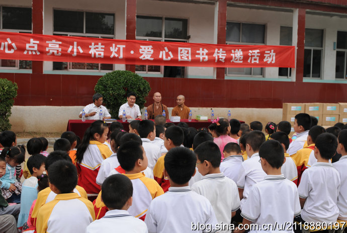 2014年9月23日秋分的清晨,朝阳杲杲,兴国禅寺—崇明寺方丈弘庵大和尚带领兴国禅寺知客:惟作法师、崇明寺常住:道心师父、道净师父,宗教总局的领导及晴空蓝义工团准时来到集合地点,载着社会各界人士的爱心图书20箱两千余册,踏上了“慈心点亮小桔灯”2014站——彩石镇玉龙小学。