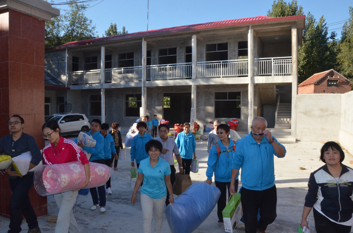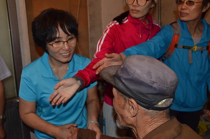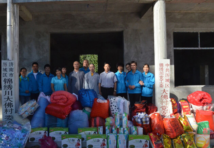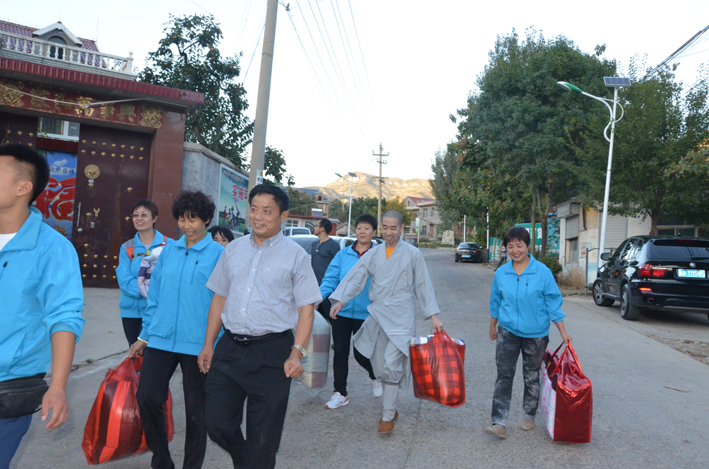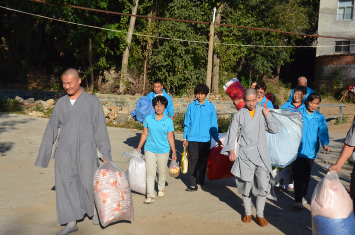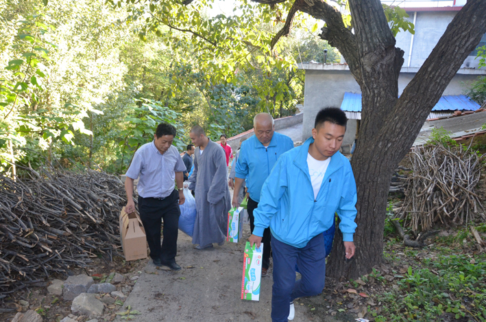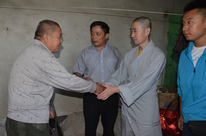 千佛山兴国禅寺崇明寺发起关爱孤寡老人爱心棉被募集活动,得到社会各界爱心人士的热情参与,特于十一国庆佳节,方丈弘庵大和尚安排崇明寺知客道悟法师和道心法师带领晴空蓝义工来到济南南部山区大佛村,将爱心棉被和米面等慰问品亲手送至孤寡老人家中,希望他们度过一个温暖的冬天。