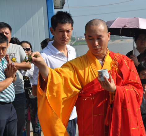 本次放生法会由上弘下庵法师主法。青年义工团部分成员随行协助维护场地秩序,保证活动顺利进行。