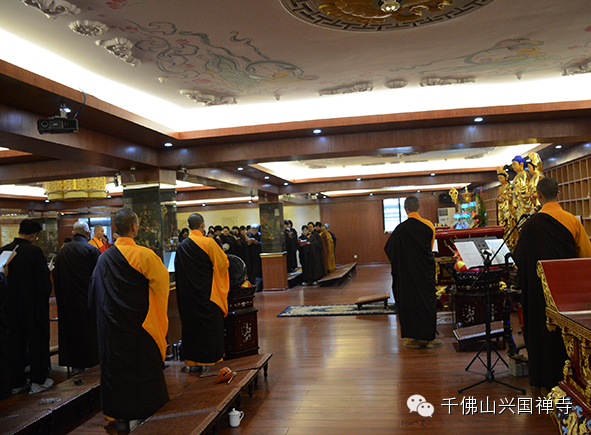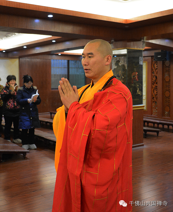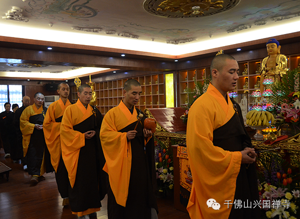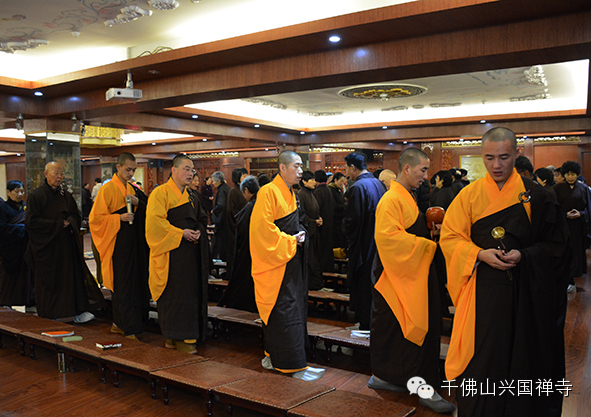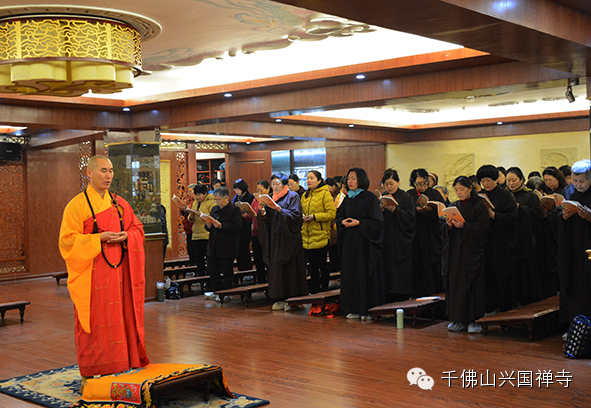 “勤修戒定慧,息灭贪嗔痴。”2015年1月12日千佛山兴国禅寺·崇明寺举行首届冬季佛七法会第五日。伽蓝僧众带领十方莲友坚持不懈的精进修行,旨在发大乘之心,度人度己。上午8点20分准时焚香上供,方丈弘庵大和尚主持法会,法器和鸣,梵呗悠扬,炉香赞毕,兴国禅寺常住:圣缘法师,崇明寺:知客道心法师、道悟法师、道净法师、道宽法师、道通法师领四众弟子开始虔诵《阿弥陀经》,持《往生咒》诚愿一切众生皆获十方三宝的加持与摄受。